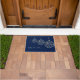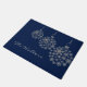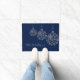Stylish holiday door mat done in dark blue, with graphics of silver tone snowflake Christmas ball ornaments. Personalize the gray text to read what you want. What a lovely way to welcome guests to your home during the holidays.