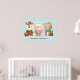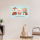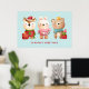 Poster with a cute illustration featuring a bunny, a bear and a deer all dressed in festive gear. Adorable and whimsical.