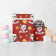 Christmas wrapping paper Personalized design with illustration of a head of cute panda with Santa's hat, in red circle, with yellow pattern with stars, Christmas holidays design for children,, with customizable text template for your name or message; illustrated by Radka Kavalcova