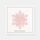 These standard style napkins are shown in the cocktail size. Shown with a single, bold Pink snowflake in the center on a white background, a thin silver-gray border with white outer border edges, and text reading Merry Christmas.