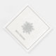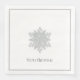 These standard style napkins are shown in the dinner size. Shown with a single, bold silver-color snowflake in the center on a white background, a thin silver-gray border with white outer border edges, and text reading Merry Christmas.