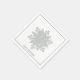 These standard style napkins are shown in the cocktail size. Shown with a single, bold silver-color snowflake in the center on a white background, a thin silver-gray border with white outer border edges, and text reading Merry Christmas.