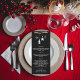 Black background, brown wood, and blue and white Christmas decor. Blue and white stars, and a blue gnome woman. Personalize and add your menu.