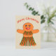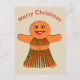 This postcard features a cute cartoon of a colorful gingerbread woman. She has black eyes with white pupils and pretty black eyelashes and a big smile on her face. She also has red and green tassels on her skirt and top ready for a Christmas party.