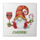 This festive ceramic tile features a cute image of a gnome elf dressed in a red and gold reindeer pattern Santa hat. He holds a Santa Claus wine glass in one hand, and a red and white striped candy cane in the other. At the bottom is a custom text field, which is shown saying Cheers! in matching green.