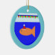 This ornament features a fun orange Christmas goldfish wearing a festive santa hat. The goldfish is swimming in the blue water of its goldfish bowl. The fish has decorated the top of the bowl with red and green bunting flags that spell out the message "Merry Fishmas". This fun seasonal fish is ready for a big Christmas party.