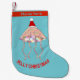 This awesome Christmas stocking features a sparkly jellyfish lit up like Christmas lights. The top of the bell is glittery and the underside looks like flashing lights, even the tentacles are bright and colorful. The Jellyfish is wearing a red and white Santa hat and is ready for a jelly Christmas. There is customizable text at the top of the stocking so it can be personalized.