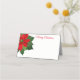 This folded name place card is shown in white with a festive Christmas red poinsettia flower.