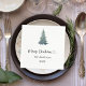 A white background, vlack text. Decorated with a watercolored green pine tree. Text: Merry Christmas. With a heart.
