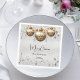 A faux silver looking background, black text. Decorated with 3 faux gold baubles and gold stars. Text: Merry Christmas. Personalize and add your family name and year.
