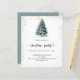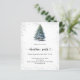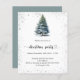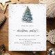 A winter invitations for a Christmas party. A white background on the front decorated with a watercolored hand-drawn pine tree with snow and faux sparkling glitter. Personalize and add your party details.