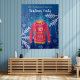 A tapestry for a fun holiday season and Christmas parties, dinners. A blue background with large white snowflakes, crystals. Decorated with an ugly red, white, orange and green xmas sweater. Personalize and add your family name. The text: Christmas Party is written in white with a modern hand lettered style script. Can be used as a welcome sign, party wall decoration or as photo booth backdrop.