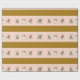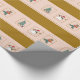 Cute wrapping paper featuring a pattern of gingerbread men, Christmas trees, and snowman on a pink background with brown stripes.