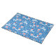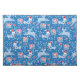 A unique Christmas style patterned canvas place mat in white, red and blue hues. This cute Christmas dinner placemat features prancing reindeer and singing robin birds with gifts, stars and snowflakes. This original pattern is uniquely illustrated and designed by Sarah Trett.