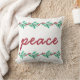This is a simple, minimalistic design with winter greenery leaves and berries across the top and bottom and the word "peace" in the center in burgundy letters on a white background. The back of the pillow is the same burgundy color.