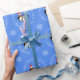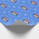 The text on this cute wrapping paper is in white and can be edited for your preferred greeting: "MERRY CHRISTMAS HAPPY NEW YEAR". The design shows a penguin family wearing stripey scarves and festive hats. The background is powder blue, and there are decorative white snowflakes too.