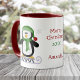 Here's a cute Holiday mug that features a sledding penguin and your own personalized text. The penguin is dressed in a Holiday green scarf and hat. He is coasting on his sled, and a few snowflakes drift down around him. The image is repeated on twice, with three text fields for your custom text in between. Perfect for big and little kids during the Christmas season!