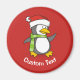 A little penguin cartoon with santa hat and green scarf walking on snow.