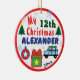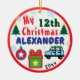 Boy 12th Christmas or Any Age Year written in green. Peace Joy green typography on backside of two-sided items, with snowman image, or Upload Your Own Photo. My Christmas in fun snowcapped red typography. Child's Name in deep blue. Insert Year. Whimsical snowflakes, trees with yellow stars, gift box, ornament, and cool light blue toy car. Original Photography and Design by TamiraZDesigns.