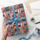 Red lined, christmas gift wrap with 9 photographs! Mistletoe, christmas trees, and christmas bulbs. The center photograph is the largest and is surrounded by a blue frame. This is a really hot look. Pattern repeats with the 9 photographs. Use the personalize prompt to download. Love! Design by HAMbyWhiteGlove aka HAMbyWG