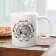 Bright green Holiday greens, brown pinecones, and red berries make up this mandala-inspired pattern. This design features Christmas holiday photo family keepsake, trendy stylish red and green, holly berries pinecones pine cones, winter greenery leaves foliage, circle photo picture gift idea, coffee tea drink drinkware cup, simple minimalist minimal style, trendy stylish calligraphy script, whimsical typography font text, Christmas holiday modern gift mug