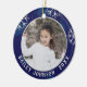 These pretty, personalized Christmas ornaments feature your photo and text on the front and your monogram on the back. They include a blue-and-white constellation pattern made of winter symbols. Use the easy templates to add your picture and text.