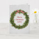 Merry Christmas greeting with red light string and gingham bow decorating green pine wreath.