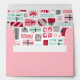 This Christmas envelope design features a red bow and a blank address label on the front, an editable return address label on the back, and a Christmas presents pattern on the lining. Original artwork by Marketa Stengl.
