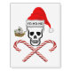 Pirate skull wearing Santa hat with YO-HO-HO written on hat. A pair of crossed candy canes are under the skull. Includes a Christmas pirate ship next to the skull.