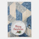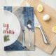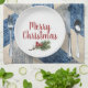 White dinner plate with silverware on blue and ivory abstract pattern and Merry Christmas text.