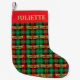 This festive Christmas stocking features a plaid background with leaves overlaid on the top of it in traditional Christmas colors and a name. The name on the stocking can be customize with the name of the recipient.