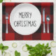 Merry Christmas text on a round white plate and silverware with red and black buffalo plaid background.