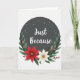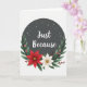 This charming design is a lovely visual affirmation set in a circular frame. The background is a deep grey disk resembling a nocturnal sky, sprinkled with delicate white specks like snow or stars. In the center, the words "Just Because" in elegant, flowing script stand out in white, bringing warmth and spontaneity. Surrounding the bottom of the circle is a lush wreath of vibrant botanicals, including emerald fir needles, a bold red poinsettia, and creamy white flowers with golden centers. Glossy crimson berries and small red-accented white blooms add to the festive feel. The colors—crisp whites, deep greens, and vivid reds—create a harmonious, joyful atmosphere. This card captures the spirit of affection and joy, perfect for sharing on Valentine's Day ❤️💌🍫.