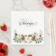 A white napkin with Christmas in a design script and watercolor Poinsettia, berries and pine cones as design elements.