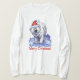 Cute Polar Bear decked out for the season wearing a santa hat on his head on the front of the shirt and a wreath on his butt on the back. The front reads Merry Christmas! and is customizable to express your own holiday greeting. This adorable character digitally painted by Traci Van Wagoner is sure to bring a smile to the face of anyone who loves to decorate for the holidays, wear Santa hats, put up wreaths, ride in a sleigh with a reindeer and the holiday season in general. Ho, ho, ho, have a fun and whimsical holiday season!