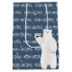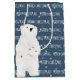 Polar bear on white MERRY CHRISTMAS text with snowflakes and stars on blue background.