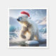 A polar bear wearing a Santa hat steps through icy waters creating dynamic splashes around its paws