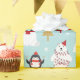 Wrapping paper with polar bears in Christmas lights and reindeer antlers and penguins in scarves.