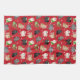 Cute Christmas dogs in festive holiday outfits. Pomeranian with cream, black, tan, gray and chocolate coats wear Santa hats, antlers, sweaters on a red background with scattered ornaments.