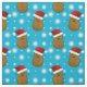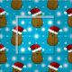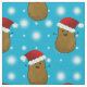 Funny repeat pattern of brown Christmas potatoes wearing red Santa hats with white trims and fluffy pompoms. Behind is a blue background with sparkly white snowflakes.