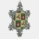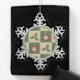 Four squares in green and tan are adorned with red ornaments decorated with white snowflakes and green holly with red berries. White stitching adds a decorative touch, giving the repeating pattern the appearance of a quilt, creating a perfectly cozy feeling for the Christmas holiday. This ornament is also available in a ball style.