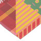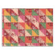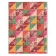 Patchwork design of holiday prints. Dancing candy canes, hanging ornaments, and falling snowflakes come together in a fun bright cheater quilt pattern.