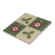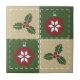 Four squares in green and tan are adorned with red ornaments decorated with white snowflakes and green holly with red berries. White stitching adds a decorative touch, giving the repeating pattern the appearance of a quilt, creating a perfectly cozy feeling for the Christmas holiday.