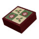 Four squares in green and tan are adorned with red ornaments decorated with white snowflakes and green holly with red berries. White stitching adds a decorative touch, giving the repeating pattern the appearance of a quilt, creating a perfectly cozy feeling for the Christmas holiday. Tiles without frames and the stone coasters will fit inside the large box to create a unique matching or combination set.