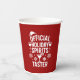Quote: Official Holiday Spirits Taster. Red background, white text. Decorated with glasses of wine, Santa's hat, coctail glass and snow crystals,