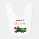 A cute illustration of a Christmas recycling garbage truck wearing a Santa hat and decorated in Christmas lights with words "Merry Christmas". An ideal Christmas baby bib design for garbage truck enthusiasts big or small, girls or boys.