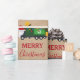 A cute illustration of a Christmas recycling garbage truck wearing a Santa hat and decorated in Christmas lights with words "Merry Christmas" and kraft brown paper look background. An ideal Christmas wrapping paper for garbage truck enthusiasts big or small, girls or boys.
