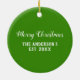 Festive geometric Christmas pattern with larger and smaller circles in red green, and silver gold polka dot accents against white background on the front. Back is solid green color with Merry Christmas written in white text. Personalize with Family Name. Original designs by TamiraZDesigns.