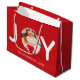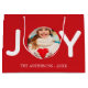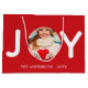 A modern minimalist Christmas gift bag in red and white. A red background, with the word JOY written with white bold letters. The letter O is used as a photo frame. Personalize and add your own family photo, name and year.