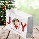 A modern minimalist Christmas gift bag in red and white. A white background, with the word JOY written with red bold letters. The letter O is used as a photo frame. Personalize and add your own family photo, name and year.